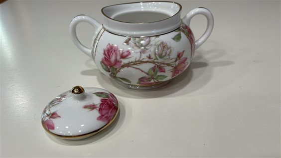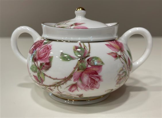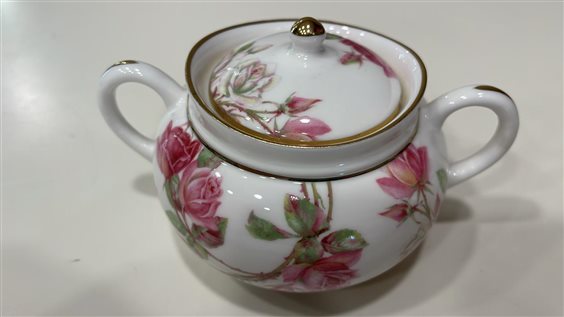 ZUCCHERIERA IN MINIATURA AYNSELY da collezione in Porcellana Limoges France bianca con decori floreali con rose fucsia e bianche e bordi in oro