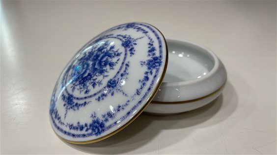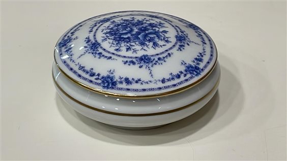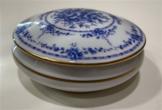 PICCOLA SCATOLA DA COLLEZIONE LIMOGES CASTEL IN PORCELLANA BIANCA E DECORI CON MOTIVI FLOREALI BLU.