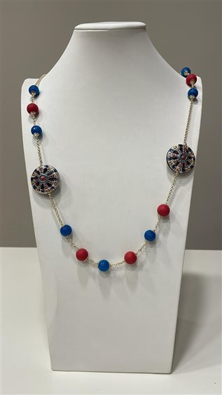 COLLANA IN ARGENTO 925 PLACCATO ORO GIALLO CON RUOTA DI CARRO IN CERAMICA DI CALTAGIRONE CON SMALTI MULTICOLOR E PIETRE NATURALI ROSSE E BLU. CHIUSURA COLLANA A MOSCHETTONE