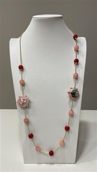 COLLANA IN ARGENTO 925 PLACCATO ORO GIALLO CON TAMBURELLI IN CERAMICA DI CALTAGIRONE ROSA CON TRINACRIA INCISA DA UN LATO E DALL'ALTRO UN CARRO SMALTATO E PIETRE NATURALI ROSA E BORDEAUX. CHIUSURA COLLANA A MOSCHETTONE