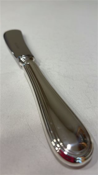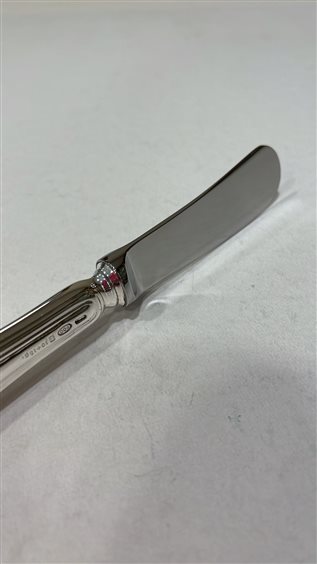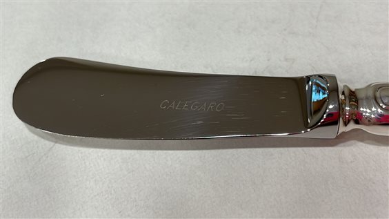 COLTELLO SPALMA BURRO CALEGARO CON MANICO IN ARGENTO 800 DAL PESO DI 13 GR, CON LAMA IN ACCIAIO. PEZZO UNICO PER LA SUA LINEA SEMPLICE ED ELEGANTE IN STILE INGLESE.
