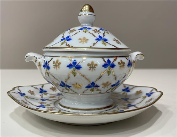 ZUCCHERIERA CON PIATTINO IN POERCELLANA LIMOGES FRANCE DECORATO A MANO,MOTIVI FLOREALI MULTICOLOR BORDO IN ORO. MISURE ZUCCHERIERA:12x10 cm MISURE PIATTO:14x12 cm