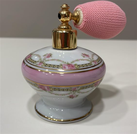 PORTAPROFUMO VINTAGE CON SPRUZZATORE MAZZANTI LIMOGES FRANCE DECORATO A MANO CON MOTIVI FLOREALI ROSE FUCSIA E DECORI IN ORO