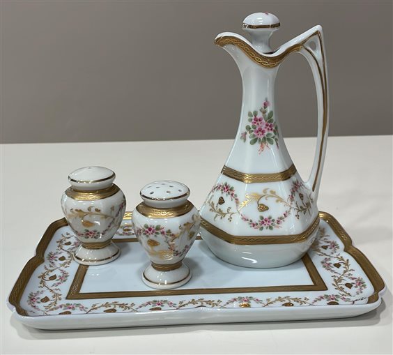 MENAGE IN PORCELLANA LIMOGES FRANCE BIANCA CON DECORI MOTIVI FLOREALI MULTICOLOR DIPINTI A MANO. E' COMPOSTO DA VASSOIO, OLIO SALE E PEPE VASSOIO: 22cm x 14cm OLIERA: 17cm PORTASALE: 6,5cm PORTAPEPE: 6,5cm