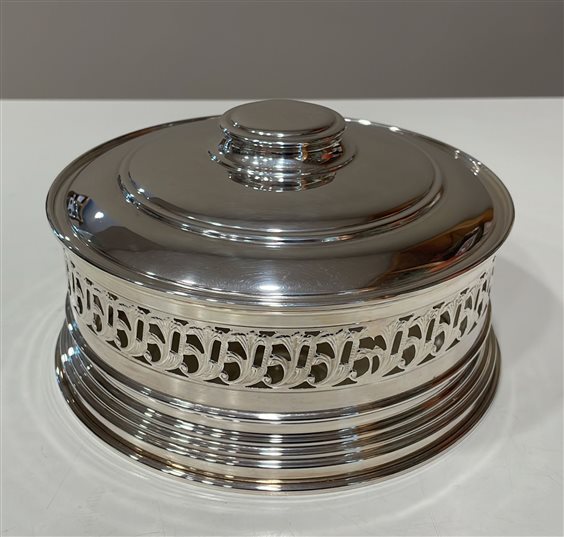 PREGIATO PEZZO D'ARGENTERIA DELL'ARTGIANATO PALERMITANO. L'ALTA QUALITA' DEI MATERIALI E DELLA LAVORAZIONE SONO GARANTITI DAI MARCHI LEGALI IMPRESSI SUL PEZZO. SCATOLA STANCAMPIAMO IN ARGENTO 925, GR 485, CON COPERCHIO, LATI TRAFORATI CESELLATI A MANO CON MOTIVI FLOREALI, SUPERFICIE LISCIA CON BORDI A RIGHE