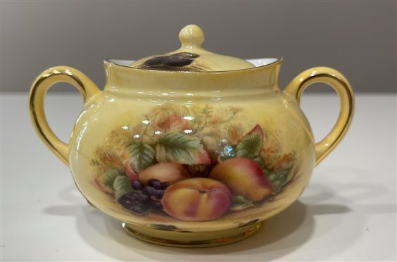 ZECCHERIERA AYNSLEY IN PORCELLANA. Aynsley China fu fondata nel 1775 da John Aynsley. L'azienda è un fornitore privilegiato della famiglia reale britannica. Questa è una delle collezione più amate e riconosciute di Aynsley: fondo giallo, Natura morta-Centro frutta autunnale. Realizzato in Inghilterra. La porcellana ossea è un tipo di porcellana a pasta morbida composta da cenere ossea, materiale feldspatico e caolino.