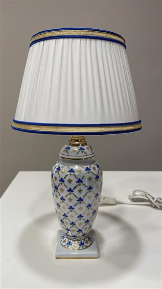 LAMPADA MAZZANTI IN PORCELLANA LIMOGE BIANCA CON DECORI ORO BLU E VERDI, COPPA IN SETA CREMA CON DECORI BLU E ORO