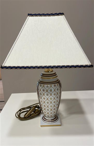 LAMPADA LIMOGES FRANCE CON DECORI FATTI A MANO MOTIVI FLOREALI BLU E ORO. COPPA IN TESSUTO BEIDE CON BORDO INTRECCIATO BLU E ORO.