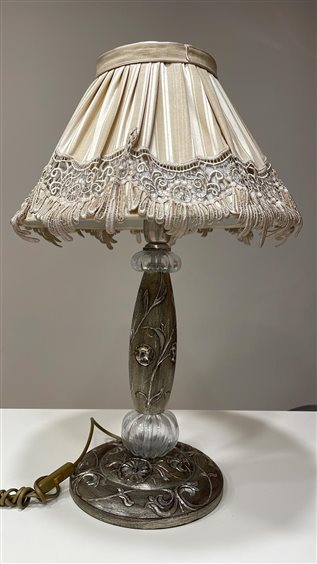 LAMPADA LUMIERE CITY IN LEGNO INCISO A MOTIVI FLOREALI, VETRO DI MURANO TRASPARENTE, COPPA IN TESSUTO BEIGE CON PIZZO.