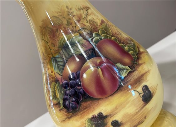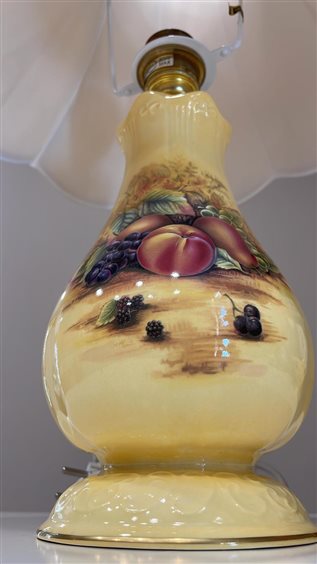 LAMPADA AYNSLEY IN PORCELLANA CON COPPA IN STOFFA FINEMNTE RIFINITA A ONDE. Aynsley China fu fondata nel 1775 da John Aynsley. L'azienda è un fornitore privilegiato della famiglia reale britannica. Questa è una delle collezione più amate e riconosciute di Aynsley: fondo giallo, Natura morta-Centro frutta autunnale. Realizzato in Inghilterra La porcellana ossea è un tipo di porcellana a pasta morbida composta da cenere ossea, materiale feldspatico e caolino.