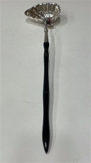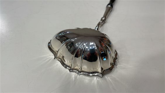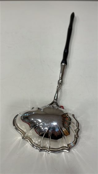 PREGIATO PEZZO D'ARGENTERIA. L'ALTA QUALITA' DEI MATERIALI E DELLA LAVORAZIONE SONO GARANTITI DAI MARCHI LEGALI IMPRESSI SUL PEZZO. MESTOLO PUNCH IN ARGENTO MASSICCIO 800, GR 85. MANICO IN LEGNO NERO E BORDO A ONDE.