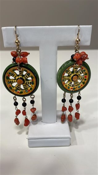 ORECCHINI PENDENTI RUOTA DI CARRO IN CERAMICA DI CALTAGIRONE, CORALLO ROSSO E PIETRE NATURALI NERE CON PERNO IN ARGENTO PLACCATO ORO GIALLO