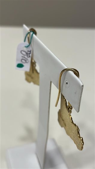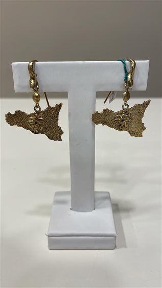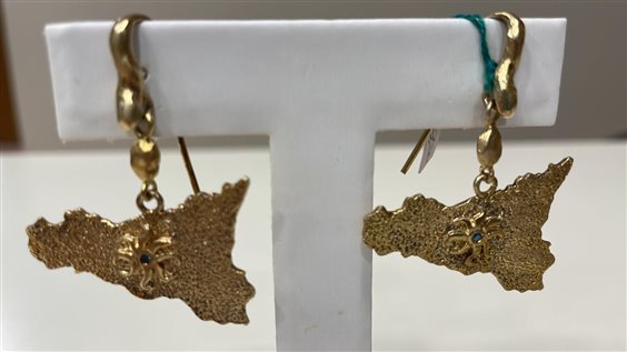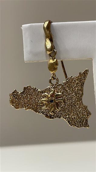 ORECCHINI TERRE DI SICILIA IN ARGENTO PLACCATO ORO GIALLO PENDENTI A FORMA DI SICILIA CON SOLE STILIZZATO E ZIRCONE BLU CENTRALE