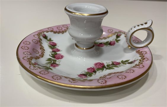 PORTACANDELE A UNA FIAMMA MAZZANTI LIMOGES FRANCE DECORATO A MANO CON MOTIVI FLOREALI ROSE FUCSIA E DECORI IN ORO, BORDO ORO. DECORATO A MANO.