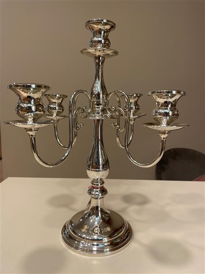 PREGIATO PEZZO D'ARGENTERIA DELL'ARTIGIANATO FIORENTINO. L'ALTA QUALITA' DEI MATERIALI E DELLA LAVORAZIONE SONO GARANTITI DAI MARCHI LEGALI IMPRESSI SUL PEZZO. CANDELIERE DI RENATO RADDI A 5 FIAMME IN ARGENTO MASSICCIO 800. IL CANDELABRO E' IN STILE INGLESE CON BASE E BORDO LISCIO.