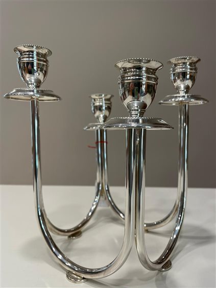 PREGIATO PEZZO D'ARGENTERIA DELL'ARTIGIANATO PALERMITANO. L'ALTA QUALITA' DEI MATERIALI E DELLA LAVORAZIONE SONO GARANTITI DAI MARCHI LEGALI IMPRESSI SUL PEZZO. CANDELIERE STANCAMPIANO A 4 FIAMME, IN ARGENTO MASSICCIO 800. STILE MODERNO.