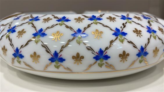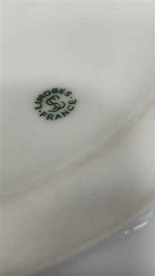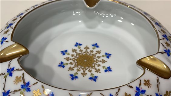 POSACENERE ROTONDO IN PORCELLANA LIMOGES FRANCE DECORATO A MANO, MOTIVI FLOREALI MULTICOLOR E BORDO IN ORO.