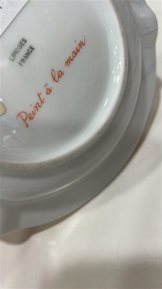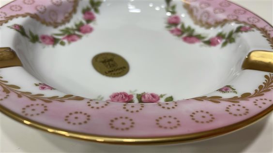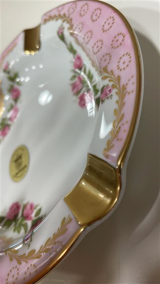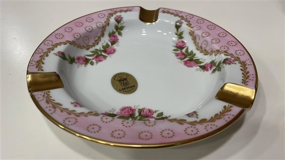 POSACENERE MAZZANTI LIMOGES FRANCE DECORATO A MANO CON MOTIVI FLOREALI ROSE FUCSIA E DECORI IN ORO, BORDO ORO