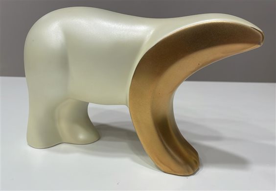 SCULTURA ELEFANTE STILIZZATO IN PORCELLANA FABBRICATO A LIMOGES, IN FRANCIA, COLOR GIALLO SATINATO CON DECORI ORO SATINATI