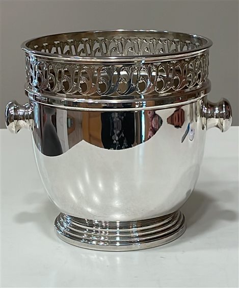 PREGIATO PEZZO D'ARGENTERIA DELL'ARTIGIANATO PALERMITANO. L'ALTA QUALITA' DEI MATERIALI E DELLA LAVORAZIONE SONO GARANTITI DAI MARCHI LEGALI IMPRESSI SUL PEZZO. SECCHIELLO GHIACCIO STANCAMPIANO IN ARGENTO, GR 561, CON BORDO LISCIO MANICI LATERALI. TRAFORATURA AL BORDO CON MOTIVI FOGLIACEI, CESELLATO A MANO.