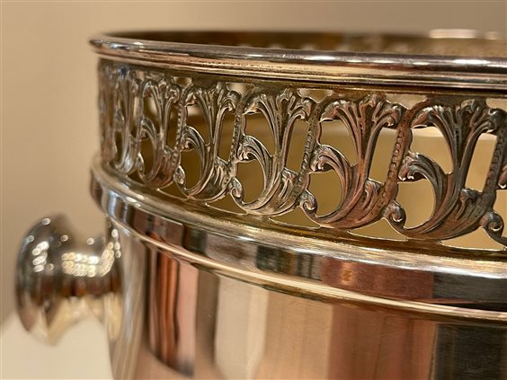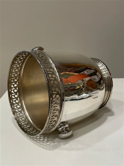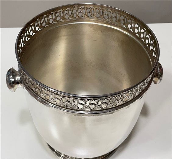 PREGIATO PEZZO D'ARGENTERIA DELL'ARTIGIANATO PALERMITANO. L'ALTA QUALITA' DEI MATERIALI E DELLA LAVORAZIONE SONO GARANTITI DAI MARCHI LEGALI IMPRESSI SUL PEZZO. SECCHIELLO GHIACCIO STANCAMPIANO IN ARGENTO 925, GR 937, CON BORDO LISCIO MANICI LATERALI. TRAFORATURA AL BORDO CON MOTIVI FOGLIACEI, CESELLATO A MANO.