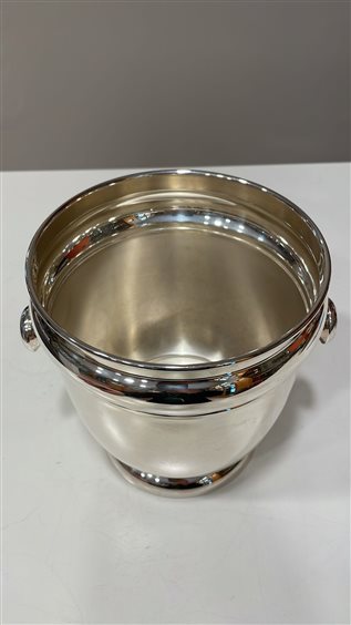PREGIATO PEZZO D'ARGENTERIA DELL'ARTIGIANATO PALERMITANO. L'ALTA QUALITA' DEI MATERIALI E DELLA LAVORAZIONE SONO GARANTITI DAI MARCHI LEGALI IMPRESSI SUL PEZZO. SECCHIELLO GHIACCIO STANCAMPIANO IN ARGENTO MASSICCIO 800, GR 539. STILE INGLESE CON BORDO E SUPERFICIE LISCI E LUCIDI.