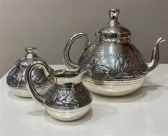 PREGIATO PEZZO D'ARGENTERIA. L'ALTA QUALITA' DEI MATERIALI E DELLA LAVORAZIONE SONO GARANTITI DAI MARCHI LEGALI IMPRESSI SUL PEZZO. SERVIZIO THE' IN ARGENTO MASSICCIO 800, CESELLATO A MANO CON MOTIVI FLOREALI E FARFALLE COMPOSTO DA: TEIERA, ZUCCHERIERA E LATTIERA. GR 1386. TEIERA: 23x26cm ZUCCHERIERA: 13x13cm LATTIERA: 11x13cm
