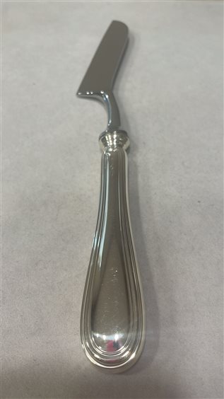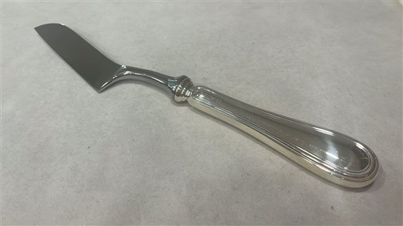 COLTELLO FORMAGGIO TENERO DAL MARCHIO ZARAMELLA, MANICO IN ARGENTO MASSICCIO 800 CON LAMA IN ACCIAIO INOX. PEZZO UNICO PER LA SUA LINEA ELEGANTE E SEMPLICE IN STILE INGLESE.