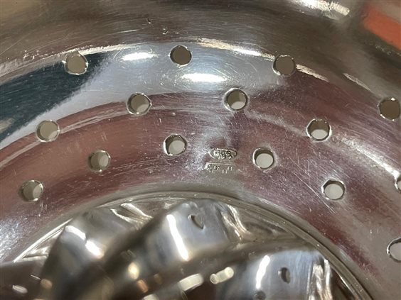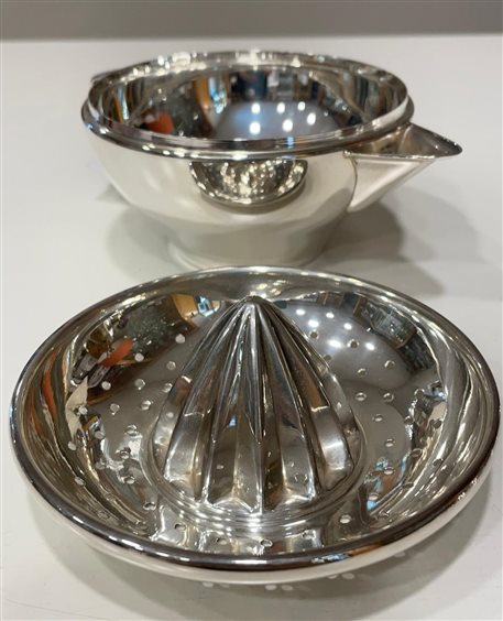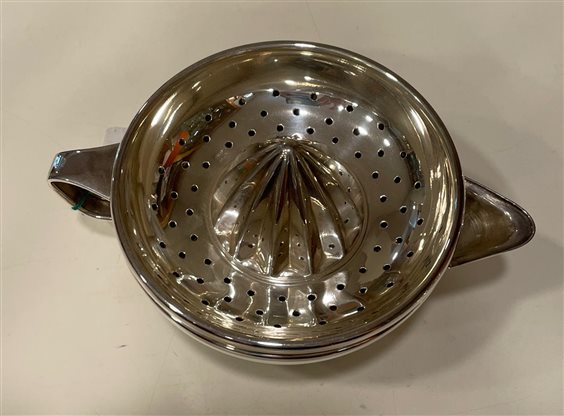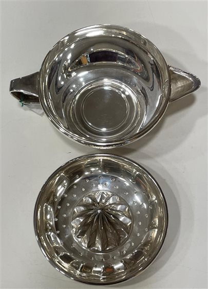 PREGIATO PEZZO D'ARGENTERIA. L'ALTA QUALITA' DEI MATERIALI E DELLA LAVORAZIONE SONO GARANTITI DAI MARCHI LEGALI IMPRESSI SUL PEZZO. SPREMIAGRUMI IN ARGENTO MASSICCIO 800, GR 113, BORDO E SUPERFICIE LISCI E LUCIDI