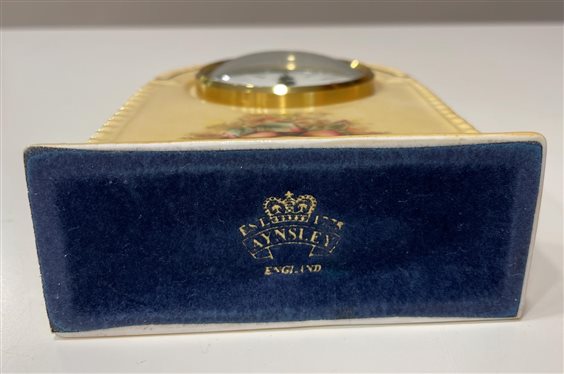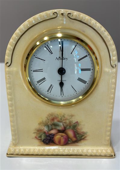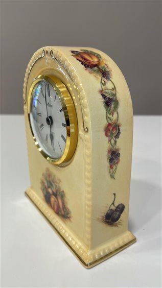 SVEGLIA MOVIMENTO A QUARZO AYNSLEY IN PORCELLANA CON GHIERA DORATA, CON QUADRANTE FONDO BIANCO E CON NUMERI ROMANI. Aynsley China fu fondata nel 1775 da John Aynsley. L'azienda è un fornitore privilegiato della famiglia reale britannica. Questa è una delle collezione più amate e riconosciute di Aynsley: fondo giallo, Natura morta-Centro frutta autunnale. Realizzato in Inghilterra La porcellana ossea è un tipo di porcellana a pasta morbida composta da cenere ossea, materiale feldspatico e caolino.
