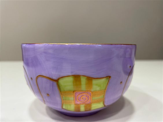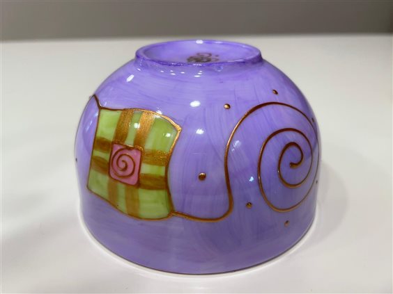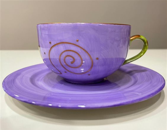 TAZZA THè CON PIATTINO IN PORCELLANA SOIZICK DAL COLORE LILLA CON DECORI RAME, ORO E VERDI. INTERNO TAZZA BIANCO. PIATTINO: 15.5x1.5 Questo oggetto fa parte della produzione Soizick che, per creare e fabbricare le sue collezioni, si è avvalsa di un'equipe di artisti, pittori, ceramisti, stilisti dell'Alta Moda e del pret-à-porter. La professionalità di ognuno nei differenti mestieri e la loro complementarietà creano una sinergia che privilegia la qualità finale dei prodotti.