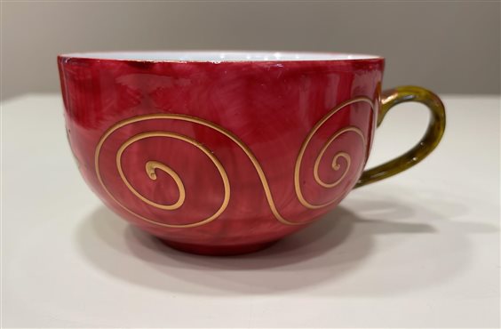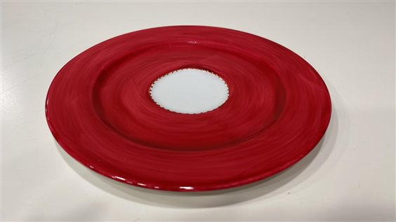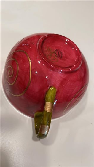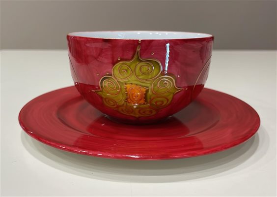 TAZZA THè CON PIATTINO IN PORCELLANA SOIZICK DAL COLORE ROSSO CON DECORI RAME, ORO, GIALLO, E VERDE. INTERNO TAZZA BIANCO. PIATTINO: 15.5x1.5 Questa è una serie di bellissime porcellane francesi di Limoges, dipinte a mano e firmate sul retro dall'artista Soizick de la Brugiere. Questo oggetto fa parte della produzione Soizick che, per creare e fabbricare le sue collezioni, si è avvalsa di un'equipe di artisti, pittori, ceramisti, stilisti dell'Alta Moda e del pret-à-porter. La professionalità di ognuno nei differenti mestieri e la loro complementarietà creano una sinergia che privilegia la qualità finale dei prodotti.