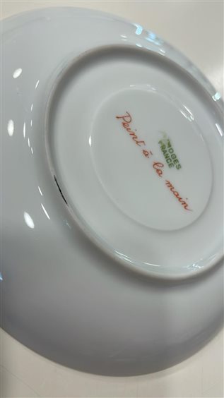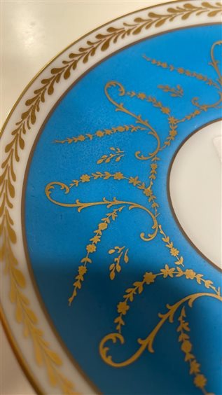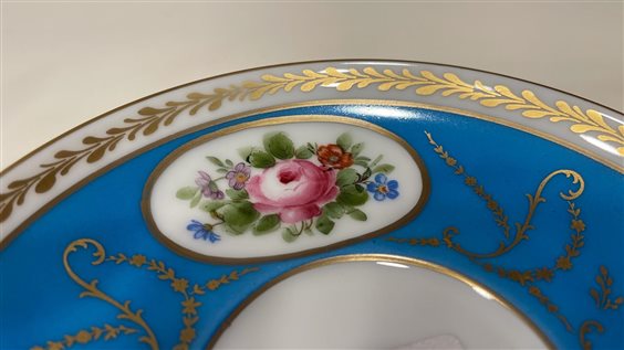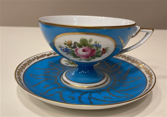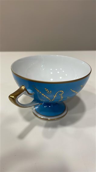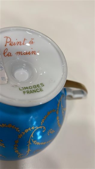 TAZZA THE' DA COLLEZIONE CON PIATTINO LIMOGES FRANCE BLU CON DECORI ORO E MOTIVI FLOREALI MULTICOLOR. DECORATA A MANO TAZZA: H7cm x 9.5cm PIATTINO: 15cm