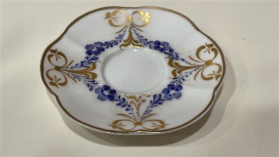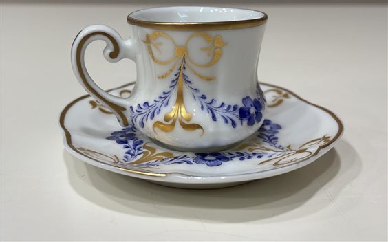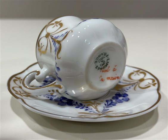 TAZZINA CON PIATTINO DA COLLEZIONE LIMOGES FRANCE IN PORCELLANA BIANCA E DECORI FATTI A MANO CON MOTIVI FLOREALI BLU E ORO. PIATTINO CON BORDO A ONDE DORATO. TAZZINA: 4CM PIATTINO: 8CM