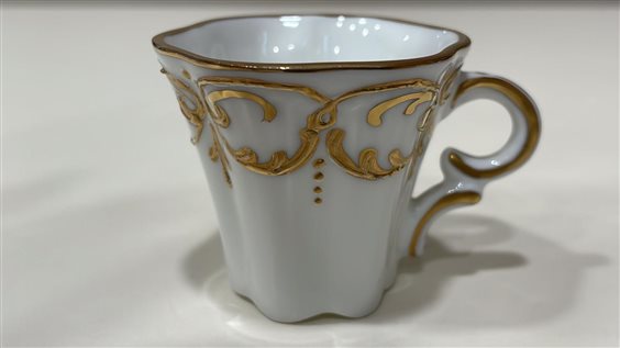 TAZZINA CON PIATTINO DA COLLEZIONE LIMOGES FRANCE IN PORCELLANA BIANCA E DECORI FATTI A MANO COLOR ORO. PIATTINO E TAZZA CON BORDO A ONDE DORATO. TAZZINA: 4CM PIATTINO: 8CM