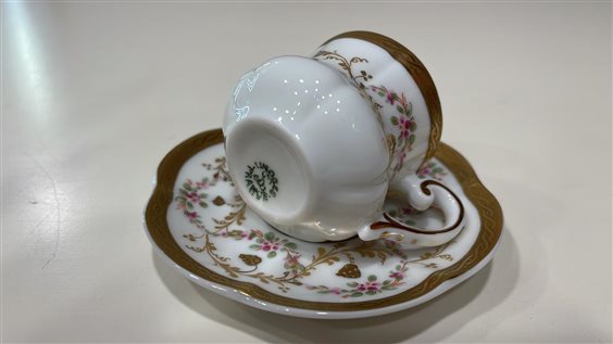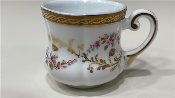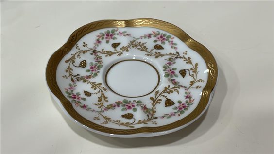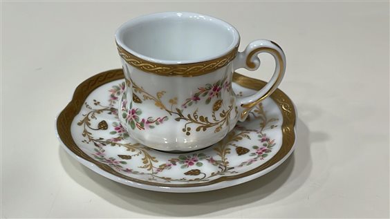 TAZZINA CON PIATTINO DA COLLEZIONE LIMOGES FRANCE IN PORCELLANA BIANCA E DECORI FATTI A MANO COLOR ORO E MOTIVI FLOREALI MULTICOLOR. PIATTINO CON BORDO A ONDE. TAZZINA: 4CM PIATTINO: 8CM