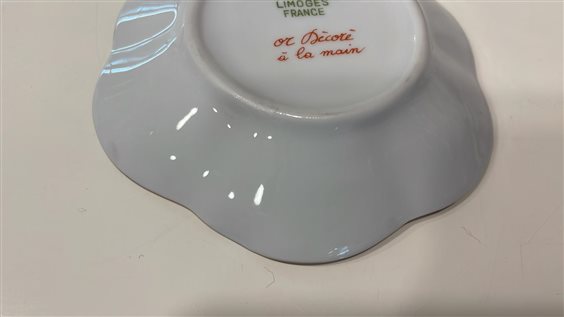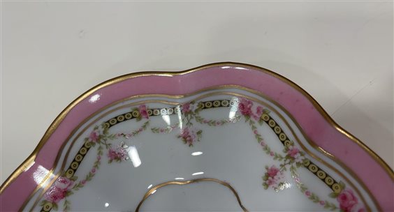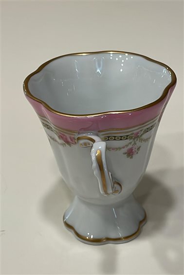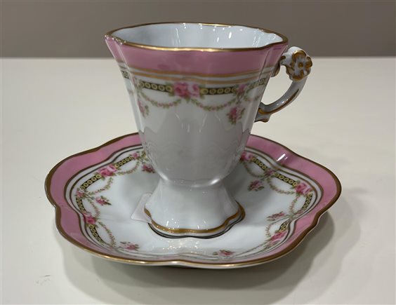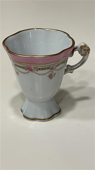 TAZZINA DA CAFFE' DA COLLEZIONE CON PIATTINO MAZZANTI LIMOGES FRANCE BIANCA CON DECORI ORO E ROSA, MOTIVI FLOREALI E BORDO A ONDE. DECORATA A MANO TAZZA: H7cm x 6cm PIATTINO: 11cm