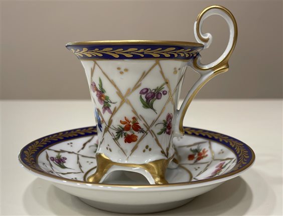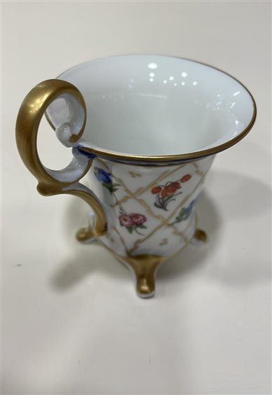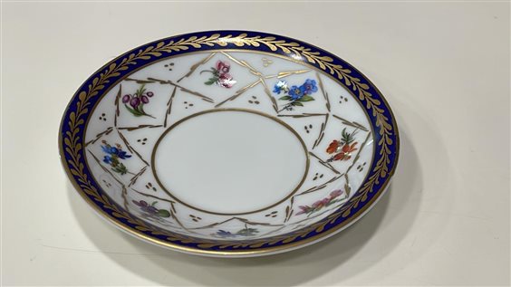 TAZZINA DA CAFFE' DA COLLEZIONE CON PIATTINO LIMOGES FRANCE CON BORDO BLU E ORO E MOTIVI FLOREALI MULTICOLOR. DECORATA A MANO TAZZA: H7cm x 6cm PIATTINO: 11cm