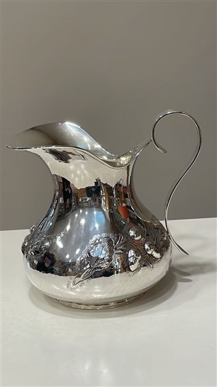 PREGIATO PEZZO D'ARGENTERIA DELL'ARTIGIANATO. L'ALTA QUALITA' DEI MATERIALI E DELLA LAVORAZIONE SONO GARANTITI DAI MARCHI LEGALI IMPRESSI SUL PEZZO. BROCCA CONTINO IN ARGENTO, GR 657. BROCCA CON INCISIONI FATTE A MANO GHIANDE E MOTIVI FOGLIACEI