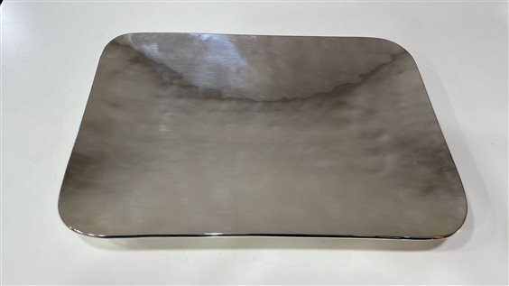 PREGIATO PEZZO D'ARGENTERIA. L'ALTA QUALITA' DEI MATERIALI E DELLA LAVORAZIONE SONO GARANTITI DAI MARCHI LEGALI IMPRESSI SUL PEZZO. VASSOIO RETTANGOLARE IN ARGENTO MASSICCIO 800 DALLA BASE MARTELLATA CON PIEDINI ROTONDI