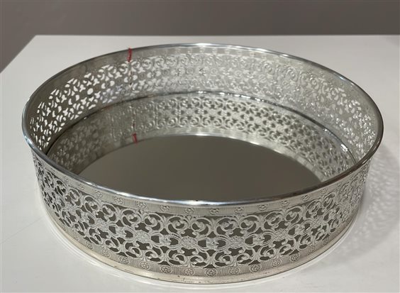 PREGIATO PEZZO D'ARGENTERIA. L'ALTA QUALITA' DEI MATERIALI E DELLA LAVORAZIONE SONO GARANTITI DAI MARCHI LEGALI IMPRESSI SUL PEZZO. VASSOIO CON BORDO CESELLATO CON MOTIVI FLOREALI CON BASE SPECCHIO GR 114