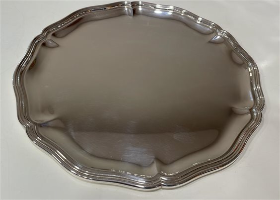 PREGIATO PEZZO D'ARGENTERIA. L'ALTA QUALITA' DEI MATERIALI E DELLA LAVORAZIONE SONO GARANTITI DAI MARCHI LEGALI IMPRESSI SUL PEZZO. VASSOIO SMERLATO ARGENTO MASSICCIO 800 BASE LISCIA
