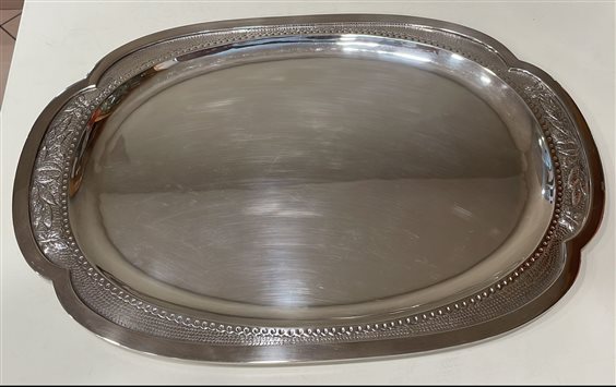 PREGIATO PEZZO D'ARGENTERIA. L'ALTA QUALITA' DEI MATERIALI E DELLA LAVORAZIONE SONO GARANTITI DAI MARCHI LEGALI IMPRESSI SUL PEZZO. VASSOIO OVALE IN ARGENTO MASSICCIO 800, CON MOTIVI FLOREALI. SUPERFICIE LISCIA E LUCIDA.