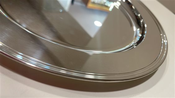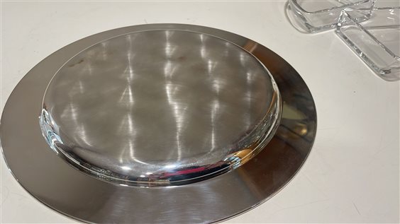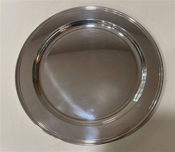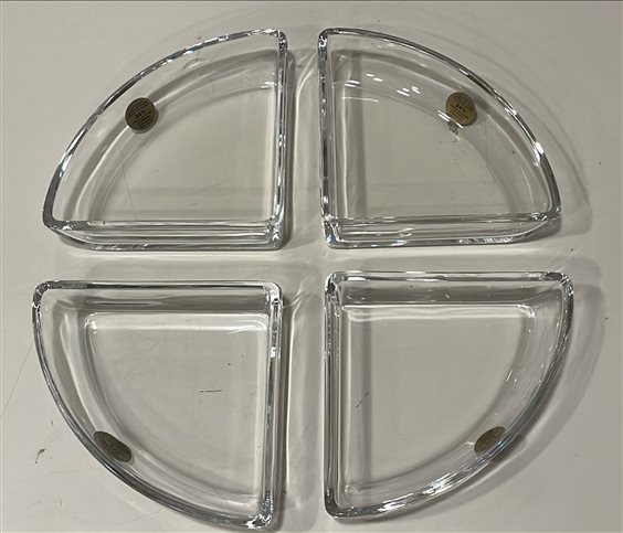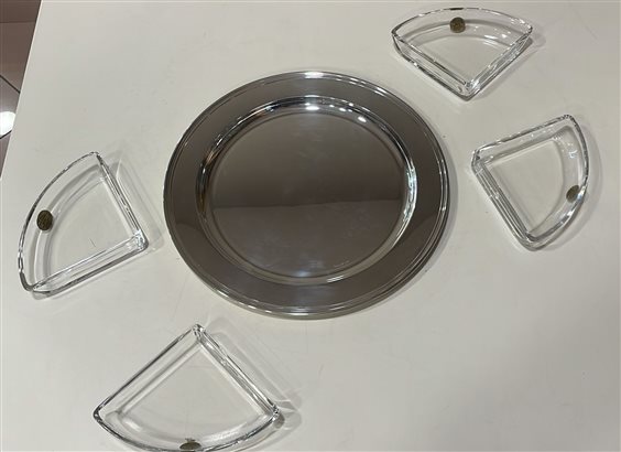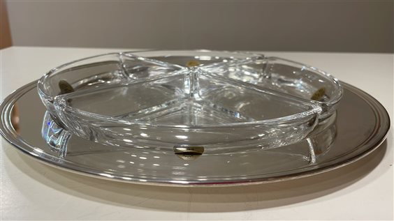 PREGIATO PEZZO D'ARGENTERIA DELL'ARTIGIANATO PALERMITANO MARCHIO STANCAMPIANO DI ALTA QUALITA' DEI MATERIALI E DELLA LAVORAZIONE SONO GARANTITI DAI MARCHI LEGALI IMPRESSI SUL PEZZO. ANTIPASTIERA STACAMPIANO COMPOSTA DA VASSOIO IN ARGENTO 800 ROTONDO STILE INGLESE A BASE LISCIA E LUCIDA, CON 4 CIOTOLE IN CRISTALLO AL PIOMBO 24%.