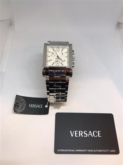 Orologio Versace uomo cassa e cinturino in acciaio inossidabile con quadrante rettangolare fondo bianco cronografo con datario posizionato al numero 4. Chiusura bracciale deployante, resistenza all'acqua 3 ATM.