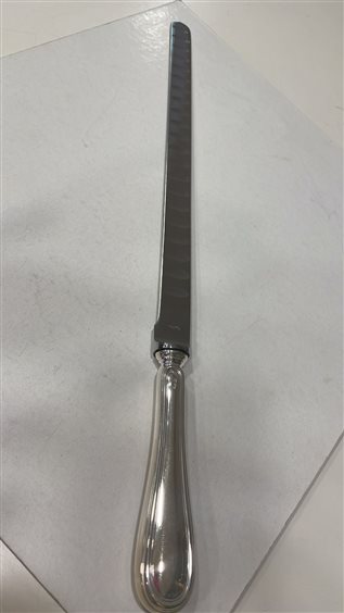 COLTELLO SALUME DAL MARCHIO ZARAMELLA, CON MANICO IN ARGENTO 800 DAL PESO 25 GR, E LAMA IN ACCIAIO INOX. PEZZO UNICO PER LA SUA LINEA SEMPLICE ED ELEGANTE DALLO STILE INGLESE.