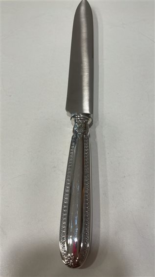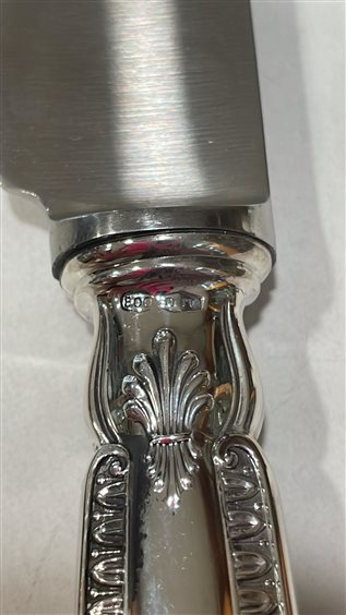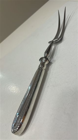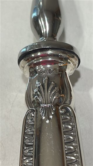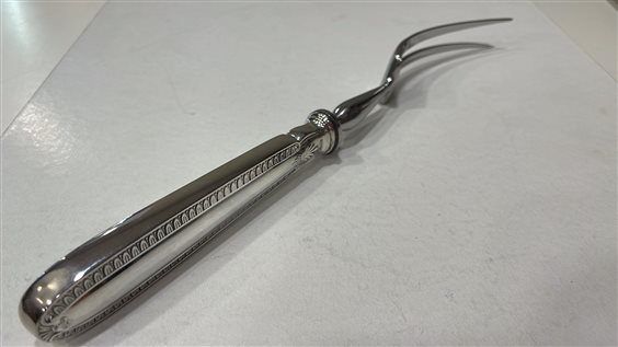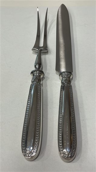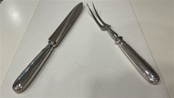 COPPIA POSATE TRINCIARE DAL MARCHIO ZARAMELLA, COLTELLO CON MANICO IN ARGENTO 800 DAL PESO DI 44 GR, LUNGHEZZA 31.5 CM LARGHEZZA 2.5 CM CON LAMA IN ACCIAIO INOX INOSSIDABILE; FORCHETTA CON MANICO IN ARGENTO 800 DAL PESO DI 44 GR CON FORCHETTA IN ACCIAIO INOX, LUNGHEZZA 28 CM, LARGHEZZA 2.5 CM. COPPIA POSATE IN STILE IMPERO.