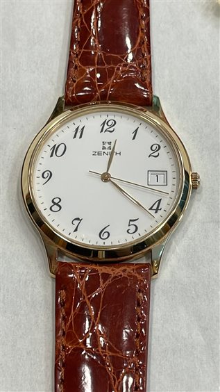 OROLOGIO ZENITH UOMO, CASSA ORO GIALLO KT 18, QUADRANTE CON FONDO BIANCO CON DATARIO POSIZIONATO AL NUMERO 3 E CON NUMERI ARABI. CINTURINO MARRONE IN PELLE DI COCCODRILLO CON CHIUSURA AD ARDIGLIONE ACCIAIO PLACCATO ORO GIALLO.