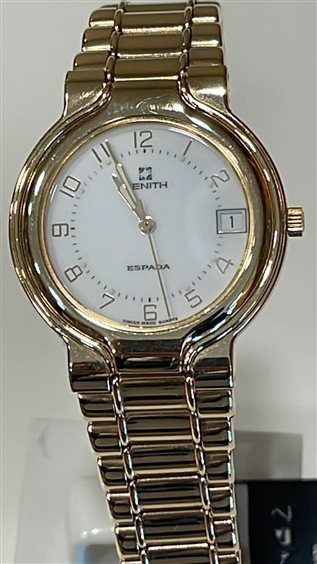 OROLOGIO ZENITH UOMO COLLEZIONE ESPADA, CASSA E CINTURINO IN ACCIAIO PLACCATO ORO GIALLO. QUADRANTE FONDO BIANCO SOLO TEMPO CON DATARIO POSIZIONATO AL NUMERO 3. CHIUSURA DEPLOYANTE E MOVIMENTO SVIZZERO AL QUARZO.