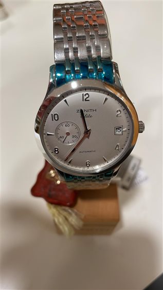 Orologio automatico nuovo di negozio in acciaio "ZENITH ELITE"con scatola e documenti originali. Cassa e cinturino in acciaio con chiusura deployante. Quadrante fondo argento solo tempo con secondiera posizionata al numero 9 e datario posizionato al numero3. Movimento automatico con resistenza all'acqua 3 ATM.